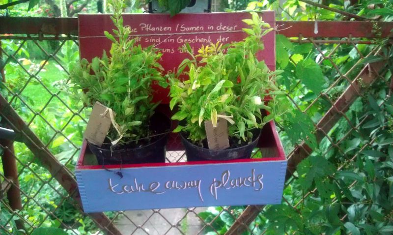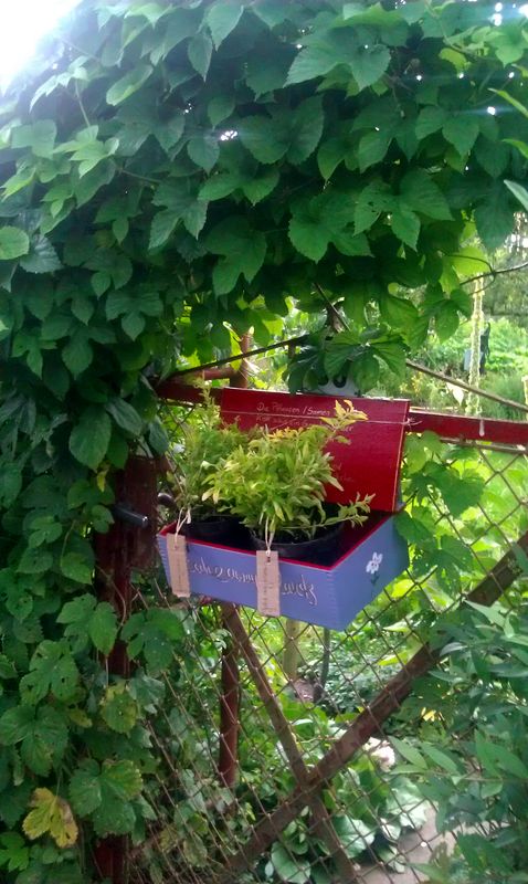 Nun können wir hier Pflanzen zum Mitnehmen an unsere Gartentür hängen. Pflanzen, die in unseren Beeten zu groß geworden sind von denen ein Teil entfernt werden muss, kommen in Töpfe und werden an die Tür gehängt.